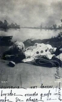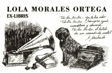 De los dos que aquí se muestran, el primero lo encargué a un artista catalán llamado Marc Boix , le expliqué que me gustaría que incluyese a mi perra y tras varias comunicaciones por carta empezó su trabajo. Realizó el dibujo original a su gusto utilizando para ello la plumilla, finalmente quedó tal como se ve: compuesto por un poema de A. Machado, una máquina de escribir antigua, un libro, un tintero con pluma, un gramófono antiguo y la efigie de mi perra Oliva. Todos estos elementos aluden a mi universo personal, lo cual tuvo en cuenta el pintor cuando aceptó el encargo.