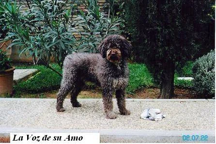 Había pasado tiempo desde mis conversaciones con Jacinto, pero recordé sus palabras y me puse manos a la obra. Busqué toda la información posible acerca de los perros de agua y me topé con el libro de Josefina Gómez Toldrá, Ediciones Tikal, "El nuevo libro del Perro de Agua Español". Lo leí de cabo a rabo y antes de terminarlo ya me habían fascinado la características de la raza. Frecuenté mercadillos de animales, leía revistas de perros y empecé a reconocerlos por la calle. No obstante, compartí mi interés con otras razas: el Cairn me atraía también, pero tenía que empezar por una raza y en el fondo había tomado una decisión..... Fuí a ver una camada de Perros de Agua, la madre me pareció preciosa, de carácter dulce. Además conocía al padre porque casualmente vivía cerca nuestra y solía verlo pasear. Los dueños de la camada, criadores de otra raza española, me dieron una magnífica impresión, parecía gente seria y totalmente enamorada de los perros, así que deposité mi confianza en ellos, ya solamente restaba escoger uno de aquellos cinco cachorrillos que correteaban torpemente como peluches con las pilas agotadas. La camada era muy homogénea: color chocolate con algunas manchas blancas, todos, excepto un macho blanco. Era dificil elegir así que me dejé llevar por la intuición y escogí a una hembrita marrón con el pecho blanco, vivaracha y con unos impresionantes ojos.Le pusimos de nombre Oliva y desde que llegó no ha dejado de asombrarme con sus ocurrencias y su mirada inteligente. Intento educarla lo mejor posible dentro de mis limitaciones aunque sé que podría sacar mucho más partido de sus habilidades, pero supongo que ella de alguna manera alcanza a comprender y acepta a cambio nuestro cariño.Y es que a pesar de ser una aprendiz en asuntos caninos, sospecho que son numerosas las maravillas que esta raza puede conseguir. Últimamente se han emitido por televisión reportajes acerca de la importante labor de salvamentos en catástrofes que perros de agua españoles han logrado trabajando en equipo con sus dueños tras un adiestramiento específico. Más conocidas son sus habilidades tradicionales con el ganado o la pesca; sin embargo, creo que en algo tan simple como la convivencia diaria con sus dueños y la familia también es capaz de superar algunas expectativas, pues aunque todos sabemos la relevancia que se le empieza a dar en nuestra sociedad a la posibilidad de mejoría de enfermos que tienen un animal doméstico, yo creo que el Perro de Agua Español con su alegría, apego a su dueño, deseos de ser útil y de participar en nuestra vida, puede darnos importantes sorpresas en la mejoría de males tan corrientes hoy en día como son las depresiones, aunque este es un tema que sería largo de tratar.Acudimos a Ubrique para confirmar a Oliva y conocer un poco el mundo que rodea a estos perros. Allí pasamos un día muy agradable contemplando ejemplares entre los que parecía dificil elegir, debido a la variedad y belleza de muchos de ellos. Conocimos a algunos socios de la AEPAE y a su presidente Antonio García, de quien ya había oido hablar.Hoy somos unos enamorados del Perro de Agua Español y con la esperanza de conocer mejor sus orígenes, trayectoria y actualidad y aportar nuestro entusiasmo, nos hemos asociado a la AEPAE.Cuando recuerdo las palabras de Jacinto, considero que fueron todo un honor; gracias.