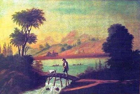 Es un óleo sobre lienzo que pertenece a mi colección particular, lo adquirí hace unos trece años, aproximadamente. No está firmado, sin embargo debe de fecharse hacia el segundo tercio del siglo XIX, y su factura pertenece a la escuela sevillana de esa etapa. Las características estilista de esta obra permiten afirmar que fue realizada durante el romanticismo, período que, como es sabido, abarca aproximadamente el reinado de Isabel II: 1833-1868. En este contexto se desarrolló una importante tendencia: la pintura costumbrista, que en la escuela sevillana conoció un gran auge debido al progresivo aunque lento cambio en la sociedad (desamortización de Mendizábal, etc.). A esta escuela pertenecieron pintores que gustaron plasmar en sus lienzos paisajes idílicos con escenas pastoriles, de contrabandistas o de un acentuado costumbrismo, como es el caso de Andrés Cortés, Manuel Barrón, Alfred Deodenq, Joaquín Domínguez Béquer o Manuel Cabral Bejarano, entre otros.