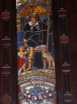 La vidriera del cancel de madera que hay antes de la puerta de entrada y que fue lo primero que ví, es de finales del siglo XIX, y se hizo reproduciendo fielmente las figuras laterales del Altar Mayor, del siglo XVII, anteriormente citadas. Curiosa correspondencia. Nada se deja al azar en esta iglesia, y la figura de San Roque, con su enorme carga simbólica aludiendo a la Caridad, seguramente fue escogida por el artífice del ideario iconográfico que rige todo el edificio: Don Miguel de Mañara.