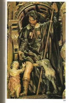 En otra visita, estando sentada en uno de los bancos pensando en lo curioso del caso, miraba hacia el Altar Mayor y quedé muy sorprendida al percibir algo que nunca antes había observado: El Altar Mayor se componía de una escena central (infinidad de veces vista) y a los lados, entre columnas salomónicas aparecían dos esculturas, no recordaba haber prestado atención antes a esas figuras y para mi sorpresa comprobé que la que estaba a la derecha era el mismo San Roque que había visto en la vidriera, con el niño y el Perro de Agua con un pan en el hocico...